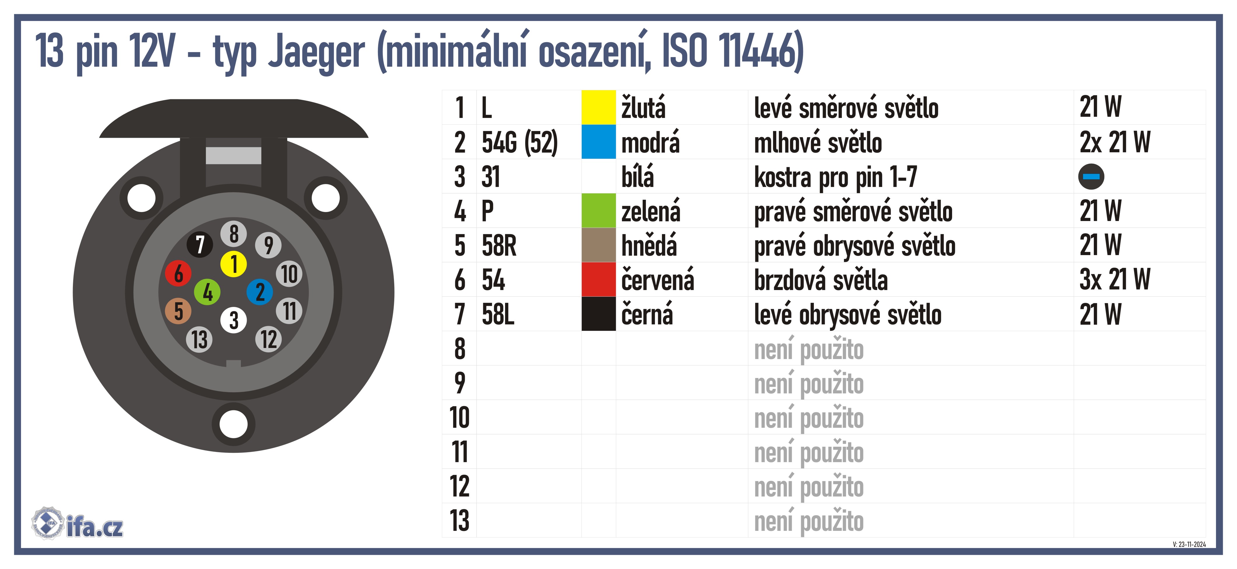 13 pin 12V - typ Jaeger (minimální obsazení, ISO 11446)