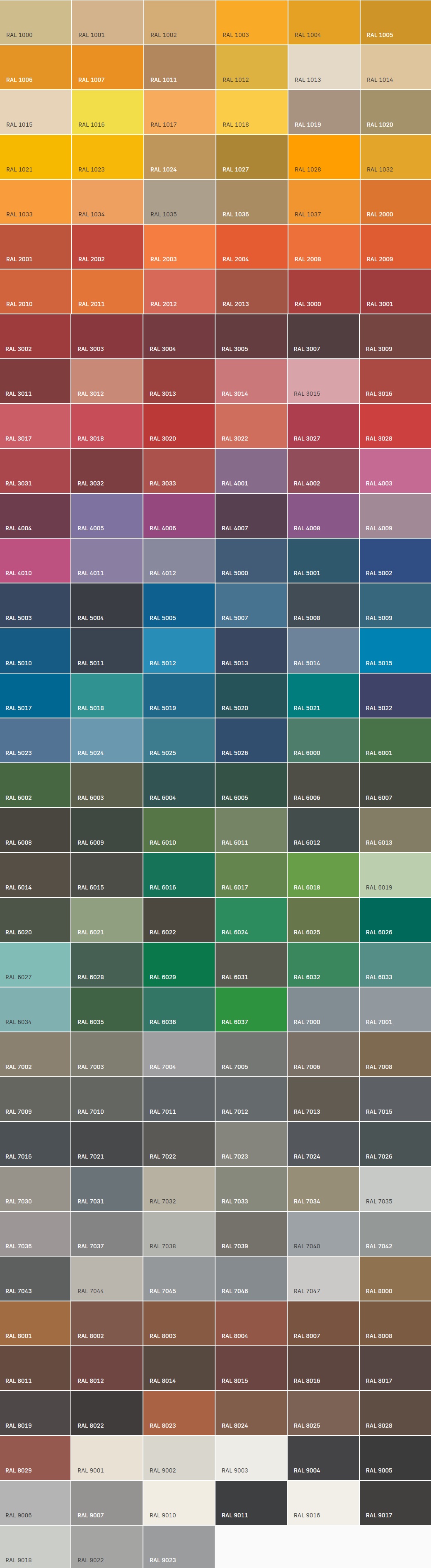 U některých barev pro vozidla IFA koncernu (uvedených v Barvy - Farben - Colors) je možnost dohledat (pokud není přímo v textu uvedeno) variantu barvy v RAL. Pro snadnější a rychlejší hledání je tu k nahlédnutí základní vzorník barev RAL. Stejně ale doporučuju porovnat fyzicky vybraný odstín přímo se vzorkem ze vzorníku. Odstíny na monitoru / displayi nemusí dokonale odpovídat...